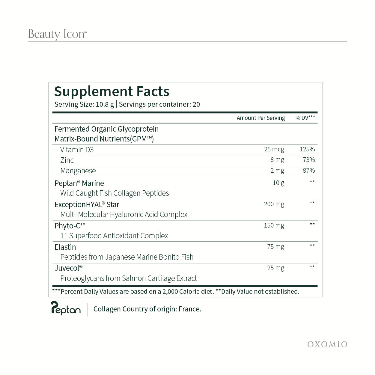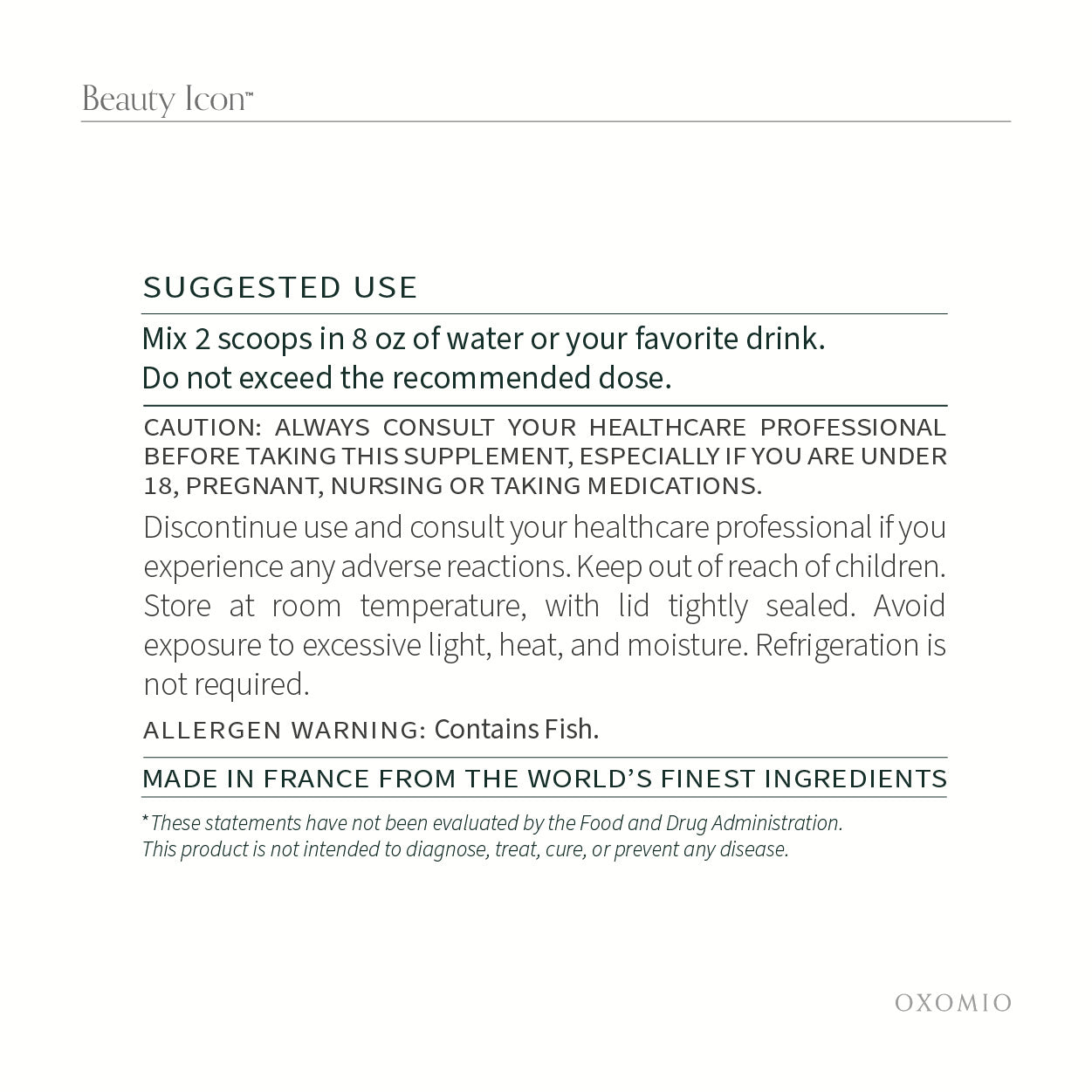 The skin is the largest organ of the body and represents the first barrier of protection against external aggressions. It is exposed daily to several factors which affect its aging process. Skin aging is characterized by features such as wrinkling, loss of elasticity, laxity, and rough-textured appearance. This aging process is accompanied with phenotypic changes in cutaneous cells as well as structural and functional changes in extracellular matrix components such as collagens, elastin, and proteoglycans that are required to provide tensile strength, elasticity, and hydration to the skin. Beauty Icon contains collagen, elastin, proteoglycans, hyaluronic acid complex, vitamins, minerals, antioxidants and other nutrients that support a healthy skin function from the inside out.